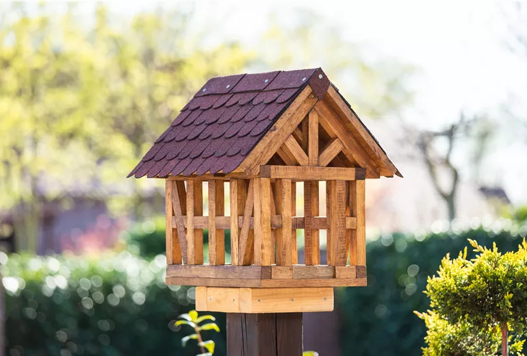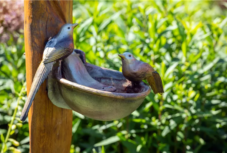 Für eine Vogeltränke ist ebenfalls meist in jedem Garten Platz. Sie hilft den Vögeln nicht nur im Hochsommer dabei, ausreichend Flüssigkeit zu erhalten. Manch ein Vogel liebt es zudem, im kühlen Nass ein Bad zu nehmen, was ebenfalls der Regulation der Körpertemperatur dient. Gern darf die Vogeltränke zugleich auch als Gartendekoration zum optischen Highlight im Garten werden. Daher hast Du beim Kauf einer Vogeltränke die Wahl zwischen unterschiedlichen Grössen, Formen und Materialien. Vogeltränken gibt es unter anderem aus Naturstein, Keramik, Terrakotta oder Metall. Ideal sind Vogeltränken mit einem flachen Rand und leicht angerauter Oberfläche, damit die Vögel sicher landen und sich festkrallen können. Die Vogeltränke sollte einen stabilen Stand aufweisen und gut zu reinigen sein. Eine Vogeltränke zum Aufhängen ist ebenfalls eine wahre Wohltat für die heimische Vogelwelt und daher eine besonders nützliche Gartendekoration. Kleinere Vogeltränken zum Aufstellen eignen sich auch für die Terrasse und locken nicht nur im Sommer zahlreiche Vögel an.