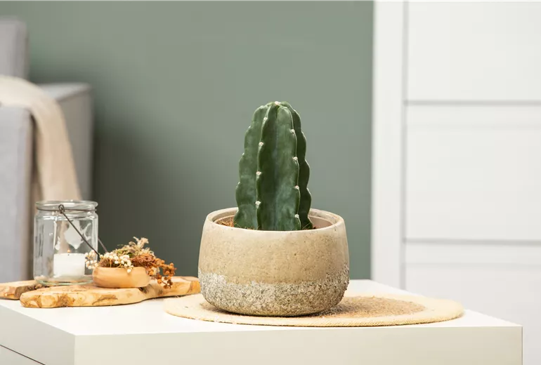 Um zu verstehen, was diese besonderen Pflanzen bei ihrer Pflege benötigen, musst Du wissen, woher sie ursprünglich stammen. Denn die Bedingungen, unter den Kakteen und andere Sukkulenten in ihrer Heimat aufwachsen, solltest Du so gut wie möglich nachahmen. Während Kakteen aus Südamerika kommen, stammen die meisten anderen Sukkulenten aus den südafrikanischen Halbwüsten. Die Pflanzen haben sich mit der Zeit an die dort herrschenden Verhältnisse angepasst. Dies sind vor allem lange Hitzeperioden ohne nennenswerte Niederschläge, weshalb sie besonders für sonnige Standorte geeignet sind. Ausserdem sind Kakteen und Sukkulenten in der Lage, Wasser für Notzeiten zu speichern. Wenn Du eine Pflanze suchst, die Du nicht allzu oft giessen musst, sind Kakteen und Sukkulenten ideal. Allerdings reagieren diese Wüstenpflanzen sehr empfindlich auf Staunässe und benötigen daher eine gute Drainage. Zusätzlich solltest Du eine Viertelstunde nach dem Giessen überschüssiges Wasser aus dem Übertopf oder Untersetzer entfernen. Gegossen werden muss ohnehin nur, wenn das Substrat nahezu trocken ist.