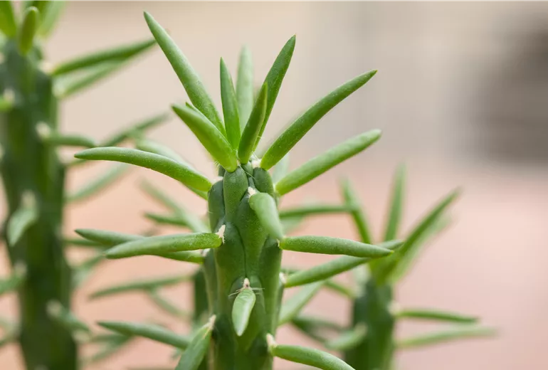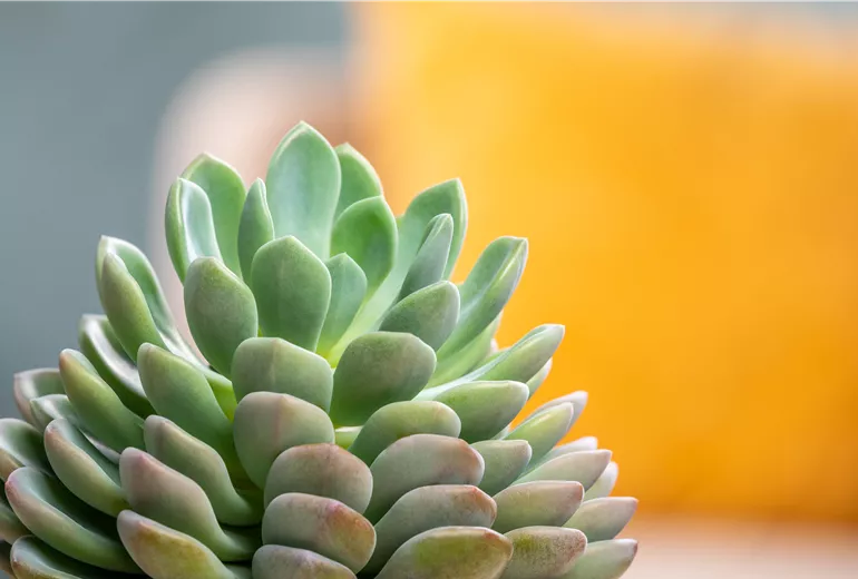 Dornenlose Sukkulenten speichern ebenfalls Wasser – meist in ihren Blättern oder Wurzeln. Daher müssen auch diese aussergewöhnlichen Pflanzen mit Zurückhaltung gegossen werden. Erst, wenn die Erde auch in der Topfmitte trocken ist, solltest Du erneut zur Giesskanne greifen. Als Faustregel gilt hier: Je dickere Blätter Deine Sukkulente hat, desto mehr Wasser hat sie gespeichert und desto weniger oft musst Du sie giessen. Während der Ruheperiode im Winter ist es ebenfalls ratsam, sie so selten wie möglich zu giessen, da hier der Nährstoff- und Wasserverbrauch der Pflanze zusätzlich reduziert ist. Auch bei diesen wasserspeichernden Schönheiten solltest Du auf Drainagelöcher im Topfboden achten und überschüssiges Wasser nach spätestens 15 Minuten aus dem Untersetzer entfernen. In oder über die Blattrosetten von Sukkulenten solltest Du jedoch nicht giessen, sondern lediglich unmittelbar über das Substrat. Gern darfst Du den Wurzeln Deiner Sukkulente statt des herkömmlichen Giessens auch ein Tauchbad gönnen. Anschliessend muss überschüssiges Wasser jedoch ebenfalls gut ablaufen können.