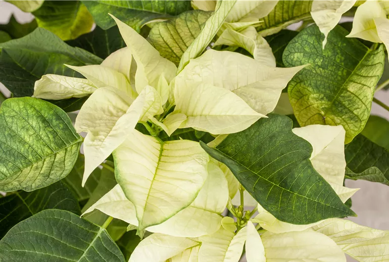 Diese rosetten- bis sternförmig angelegten und farbigen Blätter, die oftmals als Blüten bezeichnet werden, erscheinen bei guter Pflege ab November und bringen bis Februar eine farbenfroh-festliche Stimmung ins Haus. Die eigentliche Blüte ist eher unscheinbar und wird durch die blütenähnlichen, meist roten Hochblätter verdeckt, die sich um die weiblichen und männlichen Blüten herum schmiegen. Doch mittlerweile findest Du auch Weihnachtssterne mit gelben bis cremefarbenen oder rosafarbenen Hochblättern. Weihnachtssterne, die nur für eine Saison blühen, haben oft einfach zu viel Licht erhalten. Möchtest Du Dich mehrere Jahre hintereinander an den farbigen Hochblättern erfreuen, musst Du Deinen Weihnachtsstern ab Herbst täglich für 12 Stunden dunkel stellen.